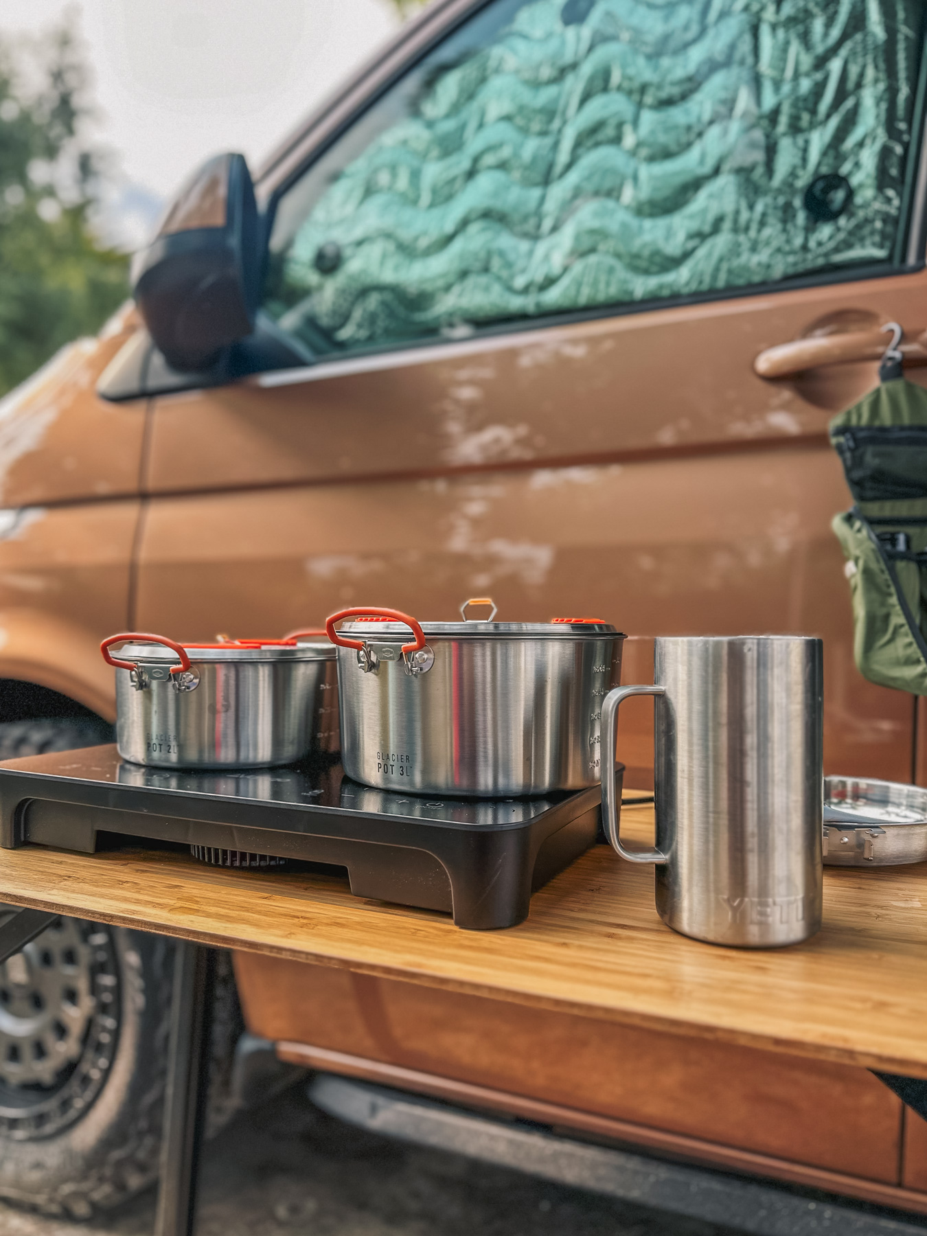 Space-saving cookware is a must when travelling in a camper. We brought two saucepans and one frying pan — that was more than enough. Make sure they nest inside each other to save room.